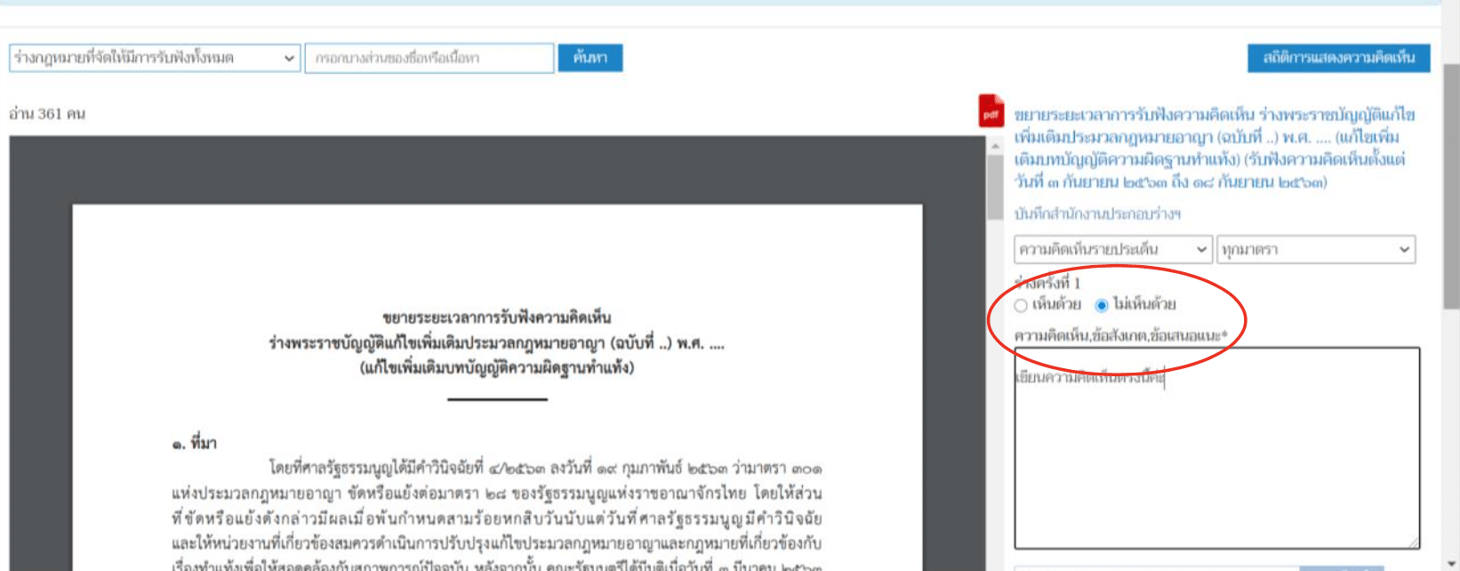 ขั้นตอนที่ 4 : เมื่อเข้าสู่ระบบได้แล้ว สามารถแสดงความคิดเห็นได้ในช่องที่กำหนด อย่าลืม กด "ไม่เห็นด้วย" ก่อนนะ แล้วให้ความเห็นประกอบ