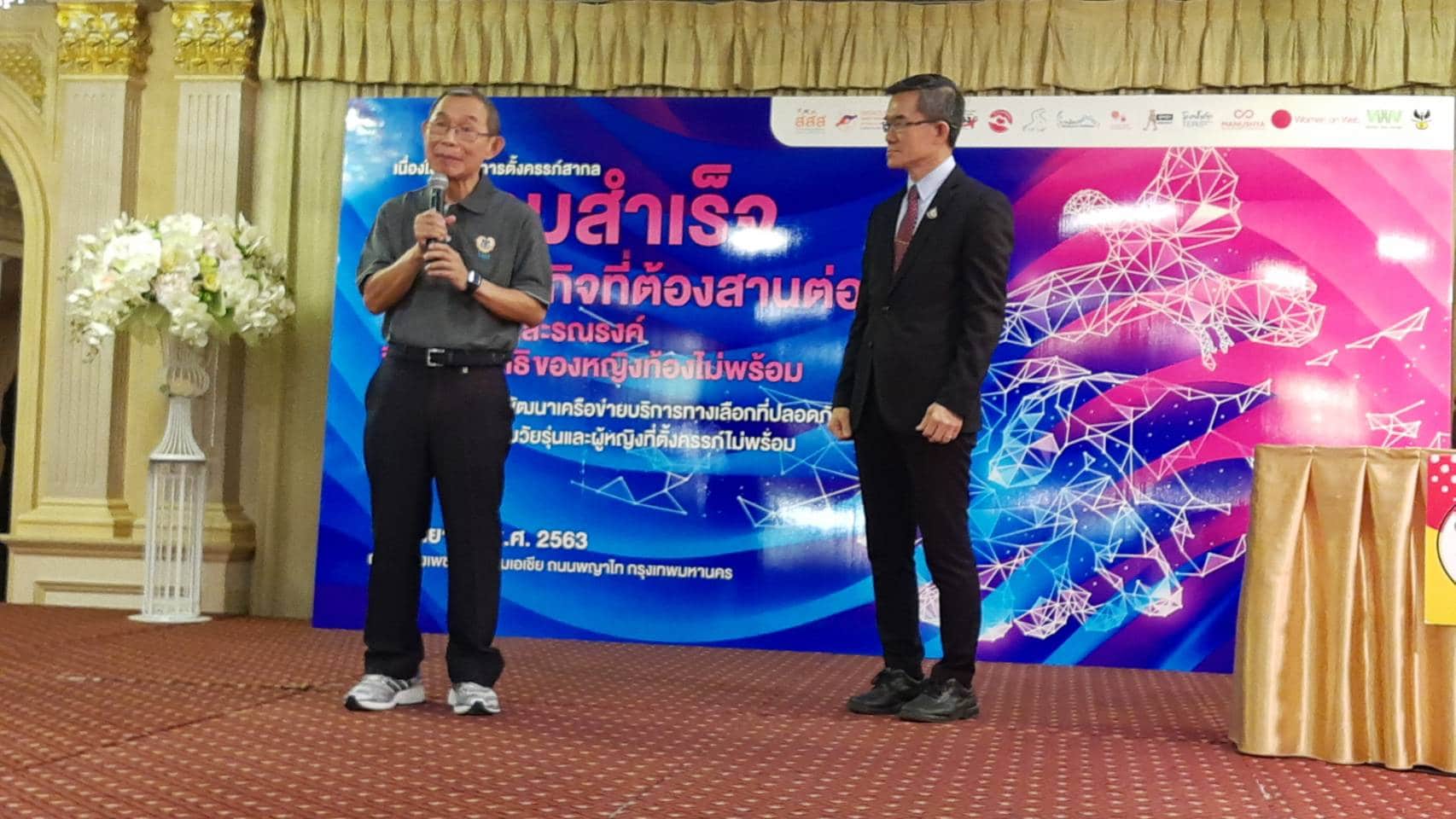 โดยได้รับเกียรติจาก นายแพทย์บัญชา ค้าของ รองอธิบดี กรมอนามัย เป็นประธานในพิธีแถลงข่าวถึงความสำเร็จของโครงการเพื่อสร้างเครือข่ายบริการทางเลือกที่ปลอดภัยสำหรับวัยรุ่นและผู้หญิงตั้งครรภ์ไม่พร้อม กล่าวว่า เป้าหมายในการพัฒนาเครือข่ายบริการทั้งการตั้งครรภ์ต่อและยุติการตั้งครรภ์ให้เกิดความเข้มแข็ง เข้าถึงได้ ปลอดภัยและเป็นมิตร เพื่อยกระดับคุณภาพชีวิตและสิทธิของหญิงท้องไม่พร้อม จึงดำเนินการร่วมกันภายใต้ 4 ข้อคือ 1) พัฒนาความเข้มแข็งและเครือข่ายหน่วยบริการที่ดูแลช่วยเหลือวัยรุ่นและผู้หญิงตั้งครรภ์ต่อ 2) ขยายบริการยุติการตั้งครรภ์ทางการแพทย์ที่ปลอดภัยอย่างทั่วถึงด้วยการพัฒนาศักยภาพและความเข้มแข็งของเครือข่าย RSA 3) สร้างความเข้าใจสาธารณะต่อสิทธิในทางเลือกของวัยรุ่นและผู้หญิงที่ตั้งครรภ์ไม่พร้อมโดยใช้เครื่องมือสื่อสารออนไลน์ การรณรงค์ และเวทีเสวนาต่างๆ 4) จัดการองค์ความรู้ (Knowledge Management) เพื่อนำไปสู่การพัฒนาและผลักดันข้อเสนอแนะเชิงนโยบาย และเพื่อให้หญิงท้องไม่พร้อมเข้าถึงการยุติการตั้งครรภ์ปลอดภัยและถูกกฎหมาย ซึ่งต้องอาศัยความร่วมมือจากเครือข่ายทุกส่วนในการร่วมกันผลักดันให้มีความปลอดภัยและถูกกฎหมาย”