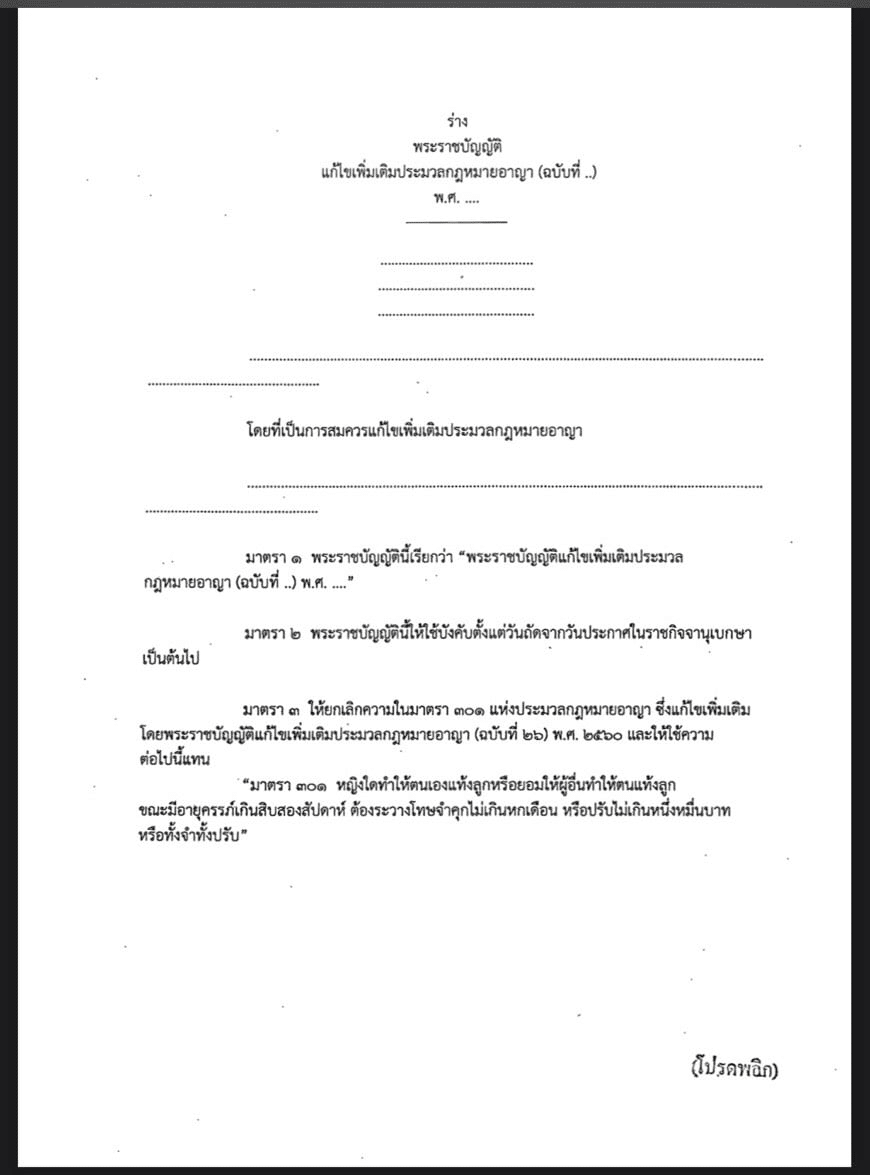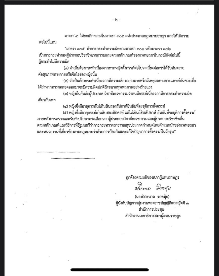 อาจารย์รณกรณ์ บุญมี จากคณะนิติศาสตร์ ธรรมศาสตร์ อธิบายดังนี้ขั้นต่อไปก็คือการทูลเกล้า และหลังจากที่ทรงลงพระปรมาภิไธยกฎหมายฉบับนี้ก็จะไปแก้ไขประมวลกฎหมายอาญา 2 มาตรา คือ มาตรา 301 และ 305 โดยมีสาระสำคัญดังนี้ 1. อายุครรภ์ไม่เกิน 12 สัปดาห์ 1.1 ตัวหญิงเจ้าของครรภ์ก) หญิงทำเอง = หญิงไม่ผิด ข) หญิงให้คน...