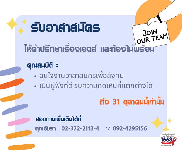 สายด่วน 1663 เปิดรับอาสาสมัครจ้า 1663 สายด่วนปรึกษาเอดส์และท้องไม่พร้อมโดยมูลนิธิเข้าถึงเอดส์ เป็นบริการปรึกษาทางโทรศัพท์ เพื่อคลี่คลายความกังวล ช่วยค้นหาทางเลือกในการจัดการปัญหาและส่งต่อบริการที่มีคุณภาพให้กับผู้รับบริการ โดยเปิดบริการทุกวัน ตั้งแต่ 09.00 -21.00 น. เปิดรับอาสาสมัครเพื่อให้บริการปร...