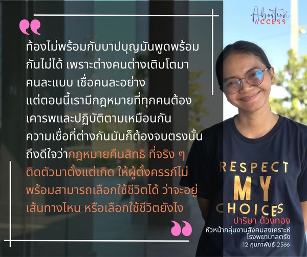 ท้องไม่พร้อมกับ บาป บุญ มันพูดพร้อมกันไม่ได้ เพราะต่างคนต่างเติบโตมาคนละแบบ เชื่อกันคนละอย่าง แต่ตอนนี้เรามีกฎหมายที่ทุกคนต้องเคารพและปฏิบัติตามเหมือนกัน ความเชื่อที่ต่างกันมันต้องจบตรงนั้น กฎหมายได้คืนสิทธิที่ติดตัวมาตั้งแต่เกิดให้กับผู้หญิงสามารถเลือกได้ว่าจะเดินในเส้นทางไหน หรือจะเลือกมีชีวิตอย่...