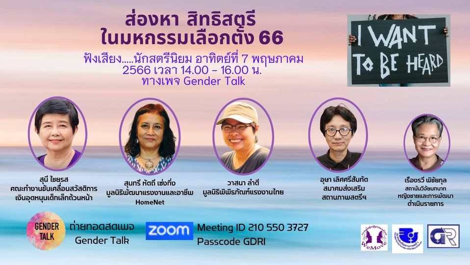 เชิญทุกท่านร่วม ถก-ถาม-ฟัง นักเคลื่อนไหว "ส่องหา สิทธิสตรี ในมหกรรมเลือกตั้ง 66" ที่เพจ Gender Talk วันอาทิตย์ที่ 7 พฤษภาคม 2566 เวลา 14.00 - 16.00 น.