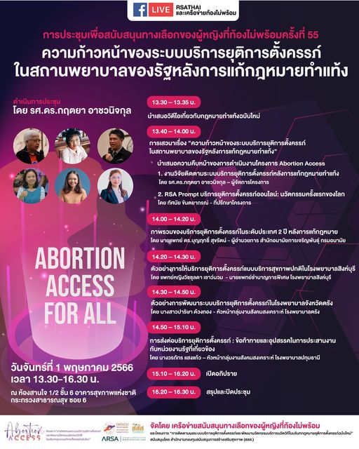 ชวนติดตามรับชม Live การประชุมเพื่อสนับสนุนทางเลือกของผู้หญิงที่ท้องไม่พร้อมครั้งที่ 55 เรื่อง “ความก้าวหน้าของระบบบริการยุติการตั้งครรภ์ในสถานพยาบาลของรัฐ หลังการแก้กฎหมายทำแท้ง” วันจันทร์ที่ 1 พฤษภาคม 2566 เวลา 13.30-16.30 น. ทาง Facebook Page : RSAThai และเครือข่ายท้องไม่พร้อม