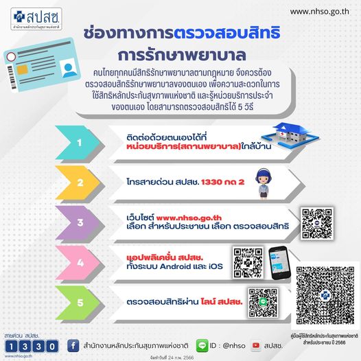 คนไทยทุกคนมีสิทธิรักษาพยาบาลตามกฎหมาย จึงควรต้องตรวจสอบสิทธิรักษาพยาบาลของตนเอง เพื่อความสะดวกในการใช้สิทธิหลักประกันสุขภาพแห่งชาติ และรู้หน่วยบริการประจำของตนเอง โดยสามารถตรวจสอบสิทธิได้ 5 วิธี