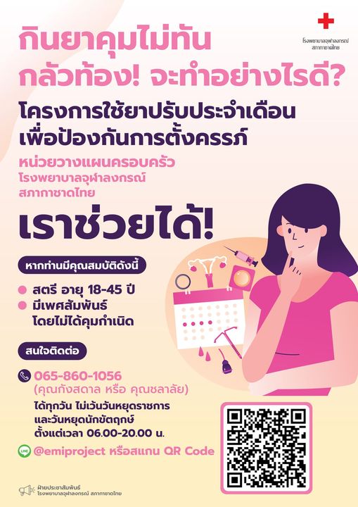 📣คุมกำเนิดไม่ทัน กลัวท้อง! จะทำอย่างไรดี? หน่วยวางแผนครอบครัว โรงพยาบาลจุฬาลงกรณ์ สภากาชาดไทย ขอประชาสัมพันธ์ “โครงการใช้ยาเพื่อป้องกันการตั้งครรภ์หลังมีเพศสัมพันธ์” หากท่านมีคุณสมบัติดังต่อไปนี้