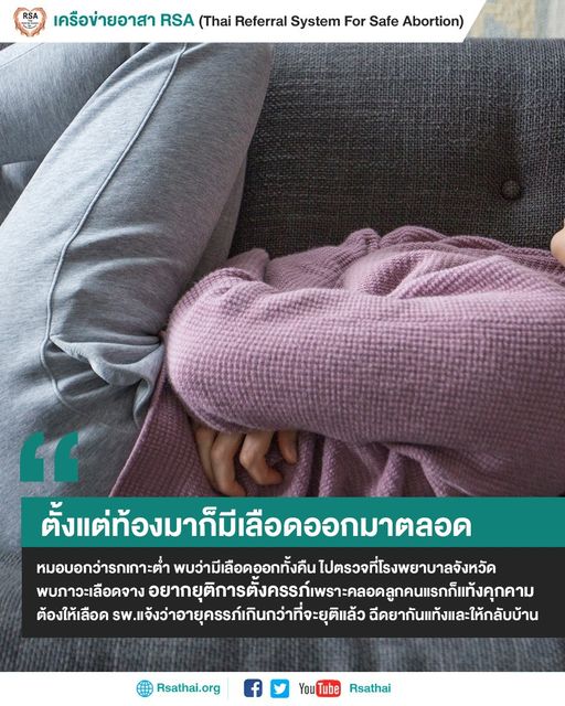 “ตั้งแต่ท้องมาก็มีเลือดออกมาตลอด หมอบอกว่ารกเกาะต่ำ พบว่ามีเลือดออกทั้งคืน ไปตรวจที่โรงพยาบาลจังหวัดพบภาวะเลือดจาง อยากยุติการตั้งครรภ์เพราะคลอดลูกคนแรกก็แท้งคุกคามต้องให้เลือด รพ.แจ้งว่าอายุครรภ์เกินกว่าที่จะยุติแล้ว ฉีดยากันแท้งและให้กลับบ้าน จึงพยายามหาข้อมูลเอง มีคนแนะนำให้ซื้อยาจากเน็ตมาใช้เอง....