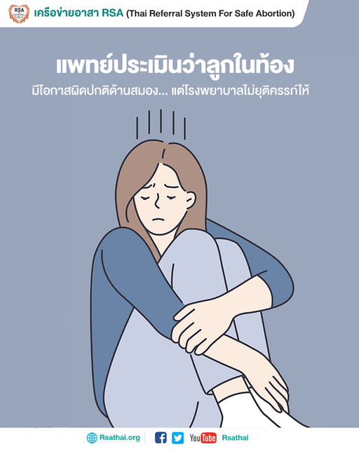 2. แพทย์ประเมินว่าทารกที่คลอดมีโอกาสผิดปกติด้านสมองแนะนำให้ยุติการตั้งครรภ์ แต่โรงพยาบาลที่ฝากครรภ์และตรวจพบความผิดปกตินี้อ้างว่าไม่สามารถให้บริการยุติการตั้งครรภ์ได้เพราะผิดศีลธรรม และเครื่องมือไม่พร้อม จึงทำหนังสือยืนยันผลตรวจแล้วแนะนำให้ไปรับบริการที่โรงเรียนแพทย์