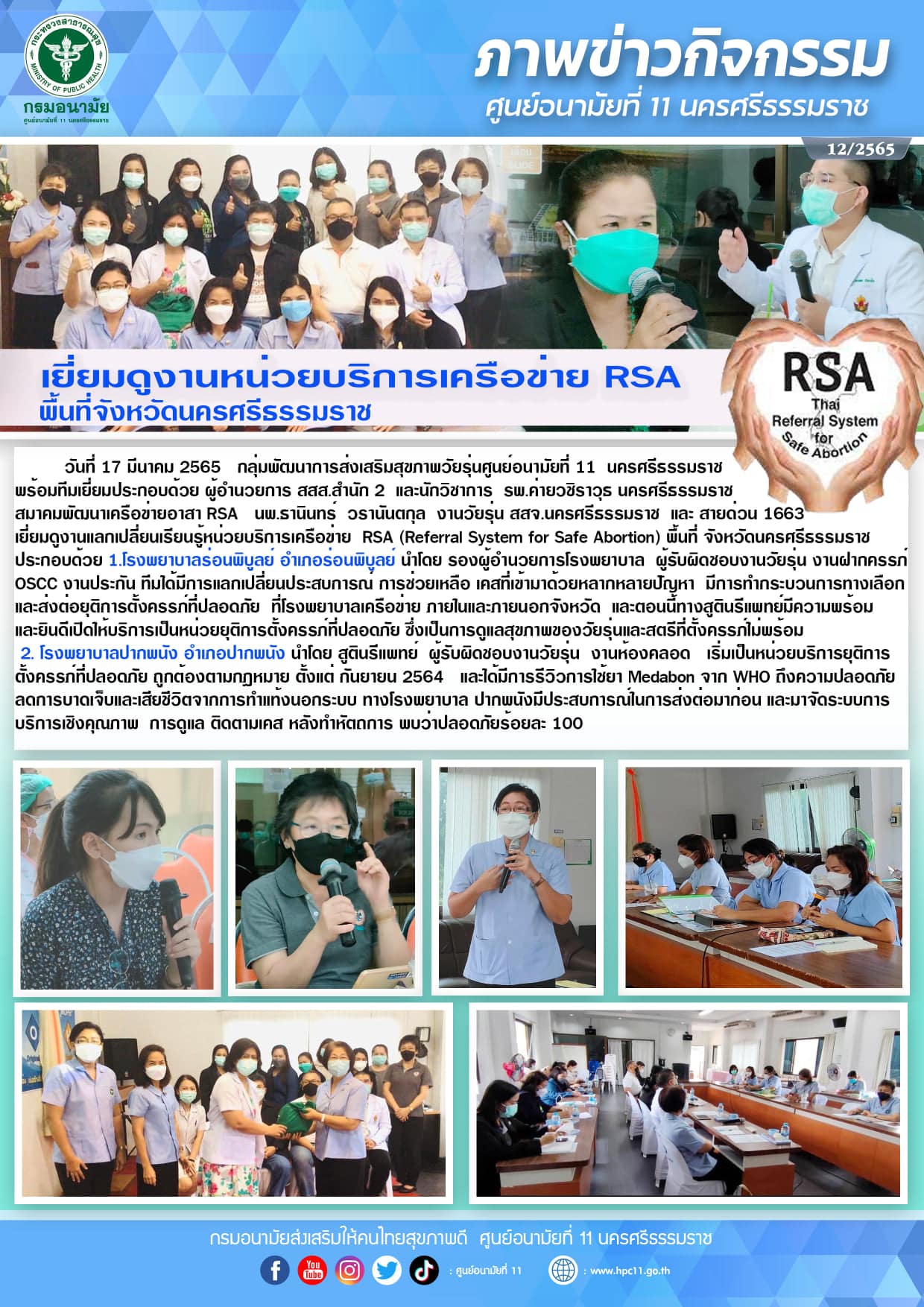 วันที่ 17 มีนาคม 2565 กลุ่มพัฒนาการส่งเสริมสุขภาพวัยรุ่นศูนย์อนามัยที่ 11 นครศรีธรรมราชพร้อมทีมเยี่ยมประกอบด้วย ผู้อำนวยการ สสส.สำนัก 2 และนักวิชาการ รพ.ค่ายวชิราวุธ นครศรีธรรมราช สมาคมพัฒนาเครือข่ายอาสา RSA นพ.ธานินทร์ วรานันตกุล งานวัยรุ่น สสจ.นครศรีธรรมราช และ สายด่วน 1663 เยี่ยมดูงานแลกเปลี่ยนเรียนรู้หน่วยบริการเครือข่าย RSA (Referral System for Safe Abortion) พื้นที่ จังหวัดนครศรีธรรมราช ประกอบด้วย